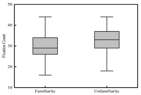 The verified results of the relationship between construction safety signs’ familiarity and visual attention proposed in the theoretical model were as follows. According to Shapiro-Wilk test, p values of TFF, FFD and FC were less than 0.05, and p value of FD was more than 0.05. Therefore, Mann-Whitney nonparametric test was applied to TFF, FFD and FC, and independent sample T-test was applied to FD. Table 4 showed that there were no significant differences between TFF and FFD of construction safety signs in different familiarity levels (Z = −0.586, p = 0.558 > 0.05; Z = −0.019, p = 0.985 > 0.05), while FC was significantly different (Z = −3.469, p = 0.001 < 0.01). As shown in Figure 7, It was a box plot of FC index of familiar and unfamiliar safety signs, in which the median of familiar signs was 29 and unfamiliar signs was 33. It showed that familiar safety signs can reduce cognitive load. The results of FD showed that there was no significant difference in safety signs of different level of familiarity (t = −1.838, p = 0.067 > 0.05). But the mean of FD in familiar signs was 7638.13 ms and the mean in unfamiliar signs was 7821.94 ms, which also indicated that familiar signs could reduce the overall cognitive difficulties. Thus, hypothesis 4 was supported as significant differences existed in one eye movement indicator of construction safety signs with different level of familiarity.