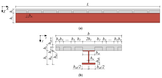 SU-WSCS is taken as an example to establish the theoretical calculation model for considering the shear-lag effect. As shown in Figure 2, the height of the steel beam is hs, of which the width and thickness of the upper flange are bst and hst, respectively, and those of the lower flange are bsb and hsb, respectively. The steel web height is hw and the thickness is bw. The width of the UHPC slab is b with the thickness of hc, where the thin plate has a thickness of hcp-w and the ribs have a height of hcr-w. b1~b4 denotes the width of the longitudinal ribs and their clear spacings, as shown in Figure 2b. The width of the transverse ribs is bw, and the total number of that is nw.