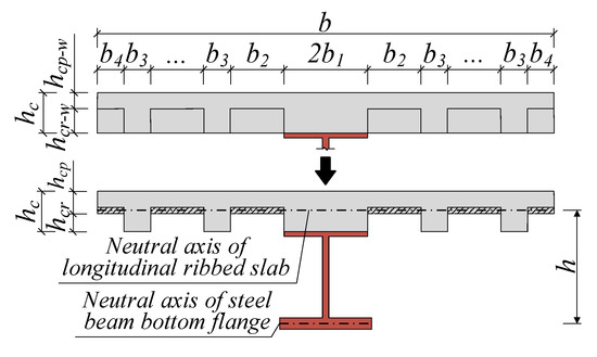 First, the transverse ribs in SU-WSCS are converted to the longitudinally ribbed slab according to the principle of constant volume, as shown in Figure 3. In this way, the equivalent thin plate thickness hcp and the longitudinal rib height hcr of the UHPC slab can be calculated using Equations (1) and (2), respectively, where L represents the span length. It is noted that there is no change in their width. The distance between the neutral axis of the UHPC slab and the neutral axis of the steel bottom flange plate is defined as h. Assume that there are a number of n longitudinal ribs, so the total width of that, br can be calculated according to Equation (3).