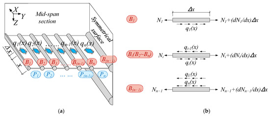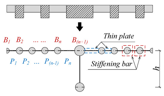 The bar simulation method considers the objective structure as an ideal combination of stiffeners and equivalent thin plates, where the equivalent thin plates only transmit shear force, and the longitudinal stiffeners only transmit axial force [24]. SU-WSCS can be divided into stiffeners and thin plates based on the ribs as shown in Figure 4. One stiffener is used to simulate the steel lower flange plate without considering its shear-lag effect. For the UHPC slab, the stiffeners are labeled as B1~Bn+1, respectively, and the thin plates are labeled as P1~Pn, respectively. It should be noted that setting additional stiffeners probably improves the accuracy of the theoretical model [19].