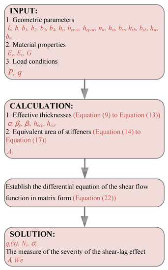 In this work, MATLAB Version 8.1 (R2013a) is used to program the above conditional equations, and the calculation process is shown in Figure 7. First, the spline function approximation method is used to solve the function expression of qi(x). Then, according to the equilibrium relationship, qi(x) is integrated along the longitudinal direction of the beam to obtain the axial force Ni of each stiffener using Equation (19). Dividing Ni by the area Ai of the corresponding stiffener to obtain the stress σi of each stiffener. At last, the shear-lag coefficient λ and effective width We of the UHPC slab in SU-RSCS are calculated.