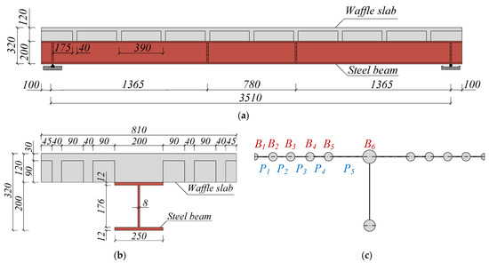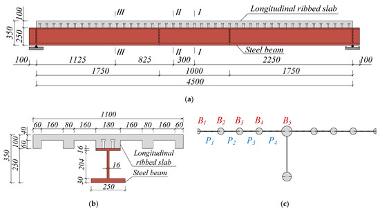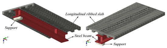First, an experimental specimen of SU-LRSCS in reference [26] is adopted here to validate the proposed approach. The detail of the test specimen is shown in Figure 8. To obtain more useful data, a half-span finite element model (FEM) is established based on the ABAQUS [27,28], as shown in Figure 9. Special attention should be paid in the modeling to impose appropriate interactions and boundary conditions [29]. The FEM is mainly composed of UHPC slab, steel beam and studs. The UHPC slab, steel beam, and studs are modeled using the element of C3D8R, which is the hexahedral linear reduced integral solid element with eight nodes. The degree of freedom (DOF) of C3D8R is 3, including translations in the X, Y and Z directions. A fixed constraint (Tie) is applied between the steel beam and studs. The contact between UHPC and steel beam is “Hard” in the normal direction and friction with a coefficient of 0.4 in the tangential direction. A boundary condition of “Symmetry” is set in the middle span section of the main beam, and the displacements in Y and Z direction are limited in the supporting point. One concentrated load distributed on the UHPC slab at the diaphragm position. Since only the elastic stage of experiment is considered, all materials are assumed to be elastic materials. The Young’s modulus, Poisson’s ratio and density of UHPC are 46,900 MPa, 0.2 and 2600 kg/m3, respectively, and that of steel are 200,000 MPa, 0.3 and 7850 kg/m3, respectively. The default convergence criterion of ABAQUS is used in this FEM.