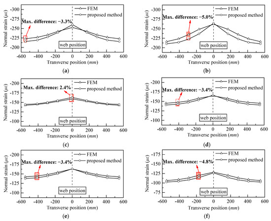 For the FEM, three sections are considered, i.e., I-I (x = 2.25 m), II-II (x = 1.950 m) and III-III (x = 1.125 m). In addition, two types of loading are simulated, namely, a two-point concentrated load with P = 200 kN (LC1) and a uniform load with q = 44.44 kN/m (LC2), as shown in Figure 11. Figure 12 plots the FEM and proposed method results under two loading tests. As can be seen, the maximum error under LC1 occurs at the stiffener B3 of section II-II, with −5.0%, and that for LC2 is −4.8% at the stiffener B4 of section III-III. It is concluded that the proposed approach can accurately predict the strain in SU-LRSCS, so as to effectively assess the shear-lag effect. In addition, Table 1 lists the comparison of the maximum shear-lag coefficient (λmax) between the FEM results and the proposed method for both load conditions. The error is within 4.6%, which pays in favor the accuracy and validity of the proposed method again.