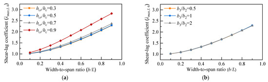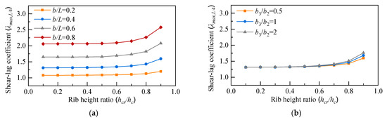 Figure 16. Relation curve of hcr/hc and λmax,L/4: (a) different b/L, (b) different b3/b2.