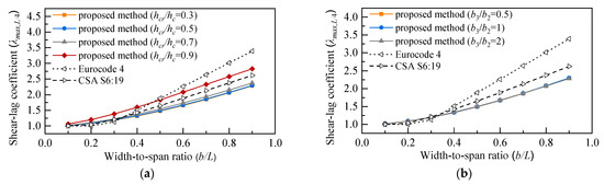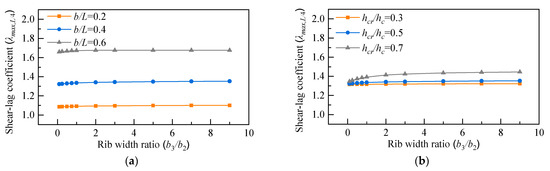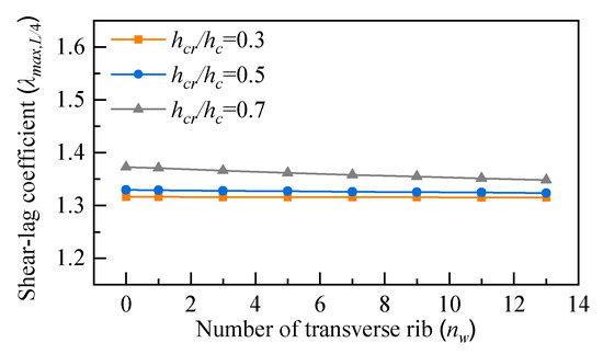 For SU-RSCS, the shear-lag effect is probably affected by many factors, such as the width-to-span of the beam, the longitudinal ribs height, the longitudinal ribs width, the number of transverse ribs, and the loading condition. The structural parameters of width-to-span ratio b/L, rib height ratio hcr/hc, and rib width ratio b3/b2 are selected for analysis in this study. Since all parameters are related to the structure dimension, they may influence each other. In order to evaluate the sensitivity of each parameter and their interaction to the shear-lag effect, the method of OA is utilized [30]. The proposed method is adopted to compute the shear-lag effect in this section. The structure in Figure 8 under the LC2 loading condition is taken as an example for analysis.