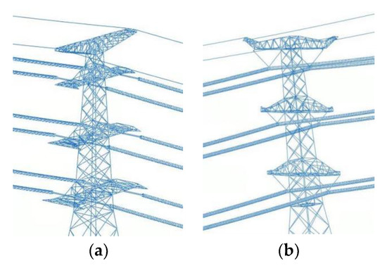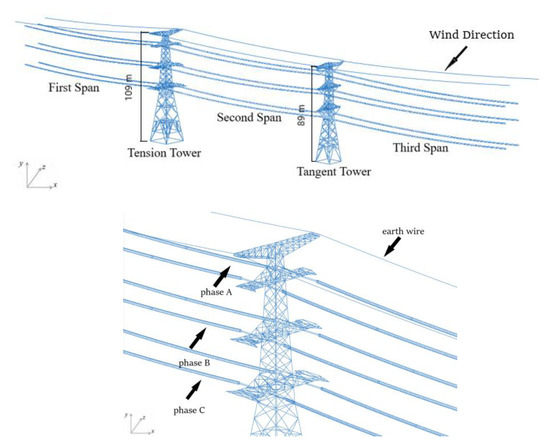 A finite element model of an iced eight-bundle conductor tower line system with a span length of 200 m and 400 m is established, as shown in Figure 1. The model is 8×LGJ-400/50 transmission line is taken as the object. The diameter of the conductor is 30 mm, and the interval between the eight sub-conductors is about 400 mm. The average the weight of spacer used to restrict the mutual movement between sub conductors is 8.5 kg, and the model is FJZ-400. The two transmission towers in the line section are the tangent tower and the tension tower, respectively. The height of the tangent tower is 89 m and the height of the tension tower is 109 m, the height difference between the tangent tower and tension tower is 11 m. The tower comprises round steel pipes, with materials Q235 and Q345 and Young’s modulus of 2.06 × 105 MPa, Poisson’s ratio of 0.3, and density of 7.8 kg/m3. According to the previous research results [21], the accuracy requirement can be met when the length of the conductor element is about 0.5 m, and the conductor is selected as the cable element, which is obtained by releasing the bending degrees of freedom of the nodes of the spatial Euler beam element [31]. The spacer can be simplified into a regular octagonal frame, simulated by spatial beam elements, and beam elements also simulate the suspension insulator string. Transmission towers are mainly round steel pipes. The transmission tower is a typical frame structure. In the design code, the towers are generally simplified as a space truss structure, and some are simplified as a space beam structure [32]. According to the structural details of the tower, the numerical model of the tower can be established. In order to ensure calculation accuracy, the tension tower and tangent tower are divided into 5387 elements and 3366 elements, respectively.