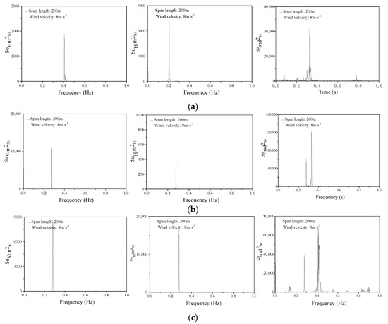 Midpoint spectrum diagram of each span of conductor under wind velocity of 8 m/s with span length: 200 m: (a) Spectrum diagram of the first span conductor; (b) Spectrum diagram of the second span conductor; (c) Spectrum diagram of the third span conductor.
