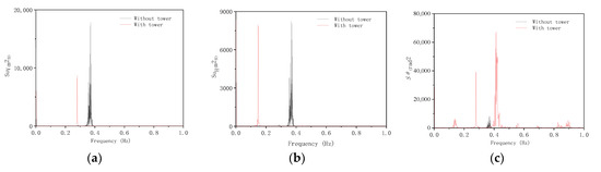 As can be seen in Figure 5, the vertical and horizontal orientation of the second and third spans of the conductor of a span length of 400 m merely excite the vibration of a single low-order mode. Vertical direction frequency is close to 0.143 Hz and 0.141 Hz, respectively, and close to 0.136 Hz in both directions horizontally. The vibration form is a single half wave of low order. While the first span excites the three vibrations of mode, all of these are three half waves in different forms, frequencies are close to 0.353 Hz and 0.465 Hz. For vibration in the torsion direction in each span, it is obvious that violent torsion has occurred. Among them, multiple peak values appeared in three torsion spectrum diagrams. It is shown that in the excited multi-order vibration of the conductor on the torsion, each peak value is close to the torsional low-order natural frequency, The vibration form is three half waves. Each span response has the same frequency characteristics. The results show that the wave response frequency characteristic of the conductor is complicated, but the vibration mode is unchanged. Compared with Ding’s [30] results, we choose the third span as the comparison object, because the third span conductors are connected to the tower by the tangent method in both models. Under the same working condition, as shown in Figure 6a–c, after considering the transmission tower, the frequency of the conductor in vertical and horizontal directions is obviously smaller than that without the tower, this is the impact of transmission tower stiffness. The conductor excites multiple natural frequencies in the torsional, indicating that multiple vibrations are multiple, which is more consistent with the real environment.