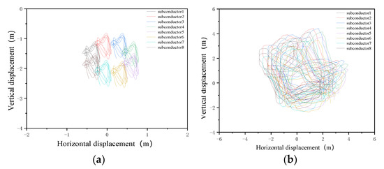 Meanwhile, the wind velocity has a great influence on the galloping amplitude and trace of the conductor. Compared with Ding’s [30] results, in the same case, after considering the transmission tower, as shown in Table 4, the galloping amplitude of the conductor is slightly larger. The time history displacement curve of the conductor is more like a fish bone. As shown in Figure 9d, the galloping trace is more chaotic. As the wind velocity increased from 4 m/s to 12 m/s, the galloping amplitude increased significantly. It is worth noting that the horizontal displacement of each span is basically less than the vertical displacement, and the trace diagram of each span is mainly elliptical, which can show that the vibration situation is mainly vertical direction vibration. Under wind velocity of 8 m/s, the galloping trace of the conductor becomes chaotic, with the shape of 8. According to Table 3, under the wind velocity of 12 m/s, the horizontal displacement of the conductor is even less than the results under the wind velocity of 8 m/s, while the vertical displacement is much greater than the results under the wind velocity of 8 m/s. It can be considered that the energy is mainly excited by the conductor in the vertical direction under the wind velocity of 12 m/s.