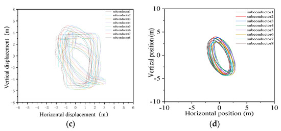 Trace diagram of Conductor displacement: (a) Trace diagram of the midpoint displacement at wind velocity 4 m/s; (b) Trace diagram of the midpoint displacement at wind velocity 8 m/s; (c) Trace diagram of the midpoint displacement at wind velocity 12 m/s; (d) Ding’s trace diagram of the midpoint displacement at wind velocity 8 m/s.
