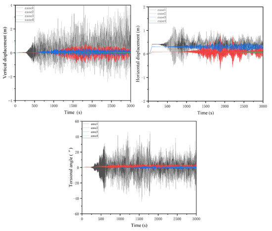 In the real environment, the range of angle of wind attack is generally not more than 60°, and the conductor will not gallop below 30°. Additionally, 30° and 60° are selected as the most representative angles. The vibration of a conductor with a span length of 200 m is simulated under the different initial angles of wind attack. Four typical cases are selected: one’s wind velocity is 8 m/s, angle of wind attack is 60°; two’s wind velocity is 4 m/s, angle of wind attack is 60°; three’s wind velocity is 8 m/s, angle of wind attack is 30°; four’s wind velocity is 4 m/s, angle of wind attack is 30°; as specific study parameters. Select the same midpoint of the conductor for comparison, and the resulting conductor galloping situation is shown in Figure 10.