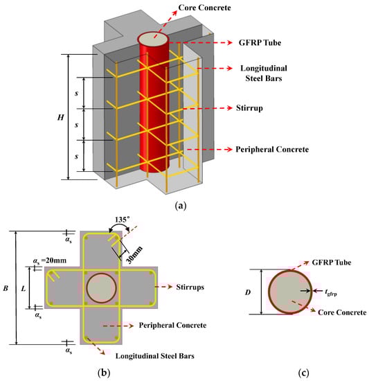 Special-shaped reinforced concrete (RC) columns can not only increase indoor space but can also avoid frame columns protruding outward because the column limbs are hidden in the wall [1]; therefore, special-shaped RC columns are widely used in construction projects. With the development of building structures to super high-rise, heavy load, and large spans, conventional special-shaped RC columns cannot meet the strength and stiffness requirements of the structure well; thus, it is extremely urgent to propose a novel kind of special-shaped reinforced concrete composite column. Fiber-reinforced polymers (FRP) have been widely used to strengthen different concrete components, such as beams, plates and columns [2,3,4,5], which can significantly improve the bending, tensile and interlaminar shear strength of the reinforced objects [6]. Moreover, composite materials have been widely used in the construction of subway support brackets, and the lifetime of the support brackets can be significantly improved by the application of composite materials [7,8]. Glass fiber-reinforced polymer (GFRP) tubes are composed of composite materials and have the advantages of excellent tensile performance in the circumferential direction, good corrosion resistance ability, eminent constraint effect on encased concrete and light self-weight; thus, the organic combination of concrete-filled GFRP tubes and the special-shaped columns can effectively improve the bearing capacity and stiffness of the composite columns [9]. Based on this, a novel kind of special-shaped reinforced concrete composite column encased with GFRP core columns (EGCSSCs) is proposed. The transversal deformation of the core concrete can be significantly reduced by the constraint of GFRP, and the failure of the external reinforced concrete can also be delayed [10,11,12,13]. The new kind of composite columns will be widely applied to the special-shaped frame structures [14].