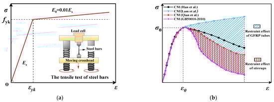 Considering the yield strengthening of steel bars, the ideal bilinear model was adopted as the elastic–plastic constitutive model (CM) of the steel bars and stirrups as shown in Figure 2a and Equation (1), where εsy and fsy are the yield strain and yield strength of steel, respectively, and E0 is equal to 0.01 Es.