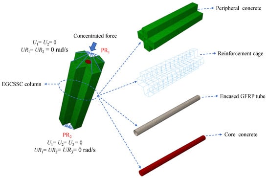 During the process of finite element modeling, it was assumed that there was no bond slip between GFRP tube and core and peripheral concrete, which are connected by binding. The hard contact was adopted between the GFRP tube and core and peripheral concrete in the normal direction. Considering the relative slip, the friction contact was adopted between the GFRP tube and core and peripheral concrete in the tangential direction, and the friction coefficient was set to 0.5 [39]. Two reference points RP1 and RP2 were set at a distance of 10 mm away from the center between two ends of EGCSSCs. RP1 was limited by displacement and rotation (U1 = U2 = 0, UR1 = UR2 = 0 rad/s), and RP2 was completely fixed, restricting the displacement in X, Y, and Z directions (U1 = U2 = U3 = 0) and the rotation in three directions (UR1 = UR2 = UR3 = 0 rad/s). The finite element model of EGCSSCs is shown in Figure 3.