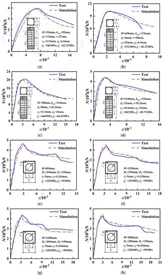 Comparison of N-ε curves between simulation and test: (a) A-1. (b)B-1. (c) C-1. (d) D-1. (e) CFSSC-3. (f) CFSSC-6. (g) CFSSC-8. (h) CFSSC-10.