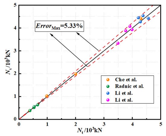 By finite element simulation, the load–strain (N-ε) curves of the above composite columns could be obtained, which are shown in Figure 4. It can be seen that the N-ε curves were in good agreement. The comparative results of the ultimate bearing capacity obtained by simulations (Ns) and experiments (Nt) are shown in Table 4 and Figure 5, and the maximum error (ErrorMAX) between Ns and Nt was 5.33%; therefore, the rationality of the FEM was verified, and the ultimate bearing capacity of the specimen could be predicted accurately by the finite element model.