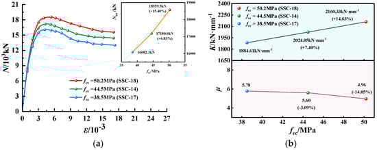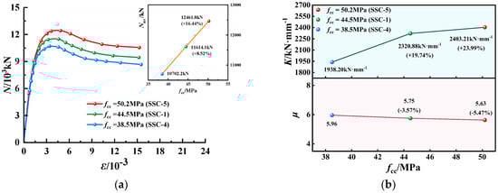 N-ε curves, K and µ of EGCSSCs with different fcc are shown in Figure 7 and Figure 8. As seen in Figure 7, when the values of fcc are given from 38.5 to 44.5 and 50.2 MPa, the ultimate axial-bearing capacity (Nus) of specimens with the cross-section height of 800 mm could be increased from 10702.2 to 11614.1 and 12461.8 kN, respectively, which increased by 8.52% and 16.44%. K could be increased from 1938.20 to 2320.88 and 2403.21 kN·mm−1, respectively, which increased by 19.74% and 23.99%. However, µ could be decreased from 5.96 to 5.75 and 5.63, respectively, which decreased by 3.57% and 5.47%. As can be seen in Figure 8, when the values of fcc are given from 38.5 to 44.5 and 50.2 MPa, Nus of specimens with the cross-section height of 1000 mm could be increased from 16082.3 to 171180.0 and 18,559.5 kN, respectively, which increased by 6.83% and 15.40%. K could be increased from 1884.6 to 2024.05 and 2160.33 kN·mm−1, respectively, which increased by 7.40% and 14.63%. However, µ could be decreased from 5.78 to 5.60 and 4.96, respectively, which decreased by 3.09% and 14.05%. It was summarized that with the increase in fcc, the Nus and K gradually increased, while µ gradually decreased. Therefore, fcc was the important parameter to the ultimate axial compression-bearing capacity of EGCSSCs.