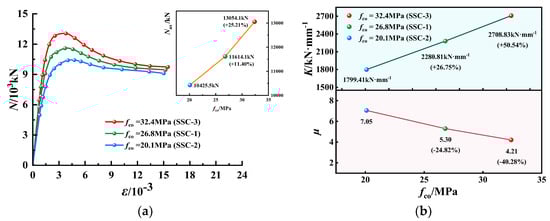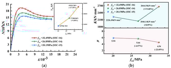 N-ε curves, K and µ of EGCSSCs with different fco are shown in Figure 9 and Figure 10. As seen in Figure 9, when the values of fco are given from 20.1 to 26.8 and 32.4 MPa, Nus of specimens with the cross-section height of 800 mm could be increased from 10,425.5 to 11,614.1 and 13,054.1 kN, respectively, which increased by 11.40% and 25.21%. K could be increased from 1799.41 to 2280.81 and 2780.83 kN·mm−1, respectively, which increased by 26.75% and 50.54%. However, µ could be decreased from 7.05 to 5.30 and 4.21, respectively, which decreased by 24.82% and 40.28%. It can be seen in Figure 10, when the values of fco are given from 20.1 to 26.8 and 32.4 MPa, Nus of specimens with the cross-section height of 1000 mm could be increased from 15,706.7 to 17,180.0 and 19,331.5 kN, respectively, which increased by 9.38% and 37.55%. K could be decreased from 2226.30 to 2046.14 kN·mm−1 firstly, and then increased to 2664.54 kN·mm−1. µ could be decreased from 5.90 to 5.66 and 4.54, respectively, which decreased by 4.07% and 23.05%. It was summarized that with the increase in fco, the Nus and K gradually increased, while the ductility of the EGCSSCs decreased, and the parameter fco had a great influence on the Nus, K and µ.
