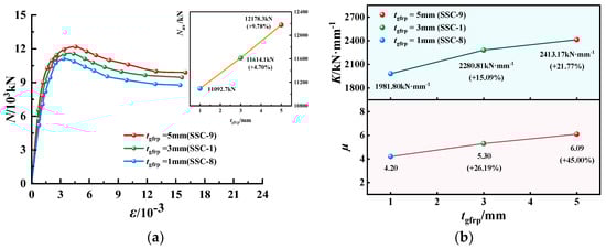 N-ε curves, K and µ of EGCSSCs with different tgfrp are shown in Figure 11 and Figure 12. As seen in Figure 11, when the values of tgfrp are given from 1 to 3 and 5 mm, Nus of specimens with the cross-section height of 800 mm could be increased from 11,092.7 to 11,614.1 and 12,178.3 kN, respectively, which increased by 4.70% and 9.78%. K could be increased from 1981.80 to 2280.81 and 2413.14 kN·mm−1, respectively, which increased by 15.09% and 21.77%. µ could be increased from 4.20 to 5.30 and 6.09, respectively, which increased by 26.19% and 45.00%. It can be seen in Figure 12, when the values of tgfrp are given from 1 to 3 and 5 mm, Nus of specimens with the cross-section height of 1000 mm could be increased from 15,950.4 to 17,180.0 and 18,243.5 kN, respectively, which increased by 7.71% and 14.38%. K could be increased from 2040.08 to 2046.14 and 2109.15 kN·mm−1, respectively, which increased by 0.30% and 3.39%. µ could be increased from 4.42 to 5.56 and 6.33, respectively, which increased by 28.05% and 43.21%. It was summarized that the Nus, K and µ of the specimens gradually increased with the increase in tgfrp, and the specimens all showed good load-holding capacity and excellent deformation ability.