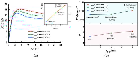 N-ε curves, K and µ of EGCSSCs with different tgfrp: (a) N-ε curves of specimens with cross-section height of 1000 mm. (b) K and µ of specimens with cross-section height of 1000 mm.