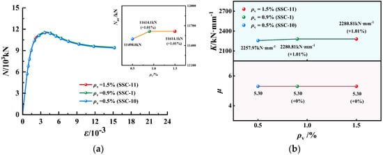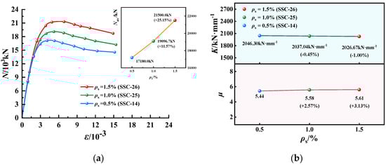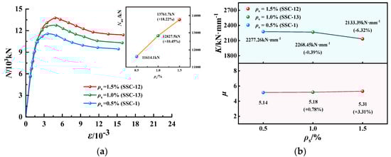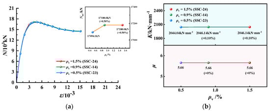 N-ε curves, K and µ of EGCSSCs with different ρs are shown in Figure 15 and Figure 16. As seen in Figure 15, when the values of ρs are given from 0.5% to 1% and 1.5%, Nus of specimens with the cross-section height of 800 mm could be increased from 11,614.1 to 12,827.5 and 13,761.7 KN, respectively, which increased by 10.45% and 18.22%. K could be decreased from 2277.26 to 2268.45 and 2133.39 kN·mm−1, respectively, which decreased by 0.39% and 6.32%. µ could be increased from 5.14 to 5.18 and 5.31, respectively, which increased by 0.78% and 3.31%. It can be seen in Figure 16, when the values of ρs are given from 0.5% to 1% and 1.5%, Nus of specimens with the cross-section height of 1000 mm could be increased from 17,180.0 to 19,096.7 and 21,500.0 kN, respectively, which increased by 11.57% and 25.15%. K could be decreased from 2046.30 to 2037.04 and 2026.67 kN·mm−1, respectively, which decreased by 0.45% and 1.00%. µ could be increased from 5.44 to 5.58 and 5.61, respectively, which increased by 2.57% and 3.13%. It was summarized that the Nus and µ of the specimens gradually increased with the increase in ρs. However, K decreased slowly with the increase in ρs.