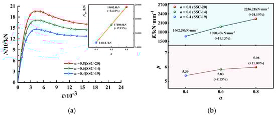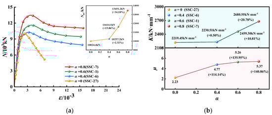 N-ε curves, K and µ of EGCSSCs with different α: (a) N-ε curves of specimens with cross-section height of 800 mm. (b) K and µ of specimens with cross-section height of 800 mm.