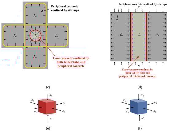 The stress states of different parts: (a) Concrete constrained by GFRP tube. (b) Concrete constrained by stirrup. (c) The cross-section of EGCSSCs. (d) The profile of EGCSSCs. (e) The element of GFRP tube. (f) The element of core and peripheral concrete.
