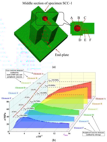 - The restraint effects on the element of EGCSSCs distributed along the circumferential direction were different, and the maximum stress of concrete elements gradually decreased from the center of EGCSSCs to the edges, indicating that the restraint effect on the core concrete was larger than that on the peripheral concrete. Moreover, the peripheral concrete reached peak stress earlier than the core concrete, and the peak stress of the peripheral concrete elements was close to that of ordinary concrete. In this paper, the confinement effects of core and peripheral concrete were simplified as the restraint effect coefficients of core concrete (λ) and peripheral concrete (λs), and λ > λs, which was consistent with the change law of the constraint effect. Because the core and peripheral concrete could not reach the peak stress at the same time, the bearing capacity of the column had a certain loss.