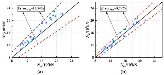 In summary, the Nus increased with the increase in fcc, fco, tgfrp, ρs and α, and µ decreased with the increase in fcc and fco. The reasons for the above changes in the Nus and µ are as follows. With the increase in fcc and fco, the load-carrying capacity of the specimens increased while the ultimate compressive strain and transverse deformation capacity of the concrete decreased, which made the restraint effects of the GFRP tube and stirrups decrease [13,37], resulting in the increase in the Nus and the decrease in the µ. The core and peripheral concrete were constrained by the GFRP tube and stirrups, respectively, and with the increase in tgfrp, ρs and ρs, the lateral deformation of the core concrete and the development of internal cracks became smaller, and the compressive strength of the core and peripheral concrete increased, thereby the Nus and µ were improved [9,37,43,44]. Moreover, the change in ρv had little effect on the Nus and µ; this was due to the small change in the cross-sectional area of the steel bars.
