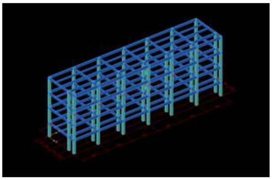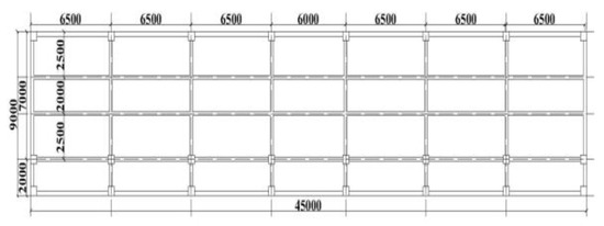 The Teaching Building of Taiping Town Central School in Lushan County is selected to be the structure prototype. The building is located in Lushan County, Ya’an City, Sichuan Province. According to the provisions in Appendix A of the Code for Seismic Design of Buildings (GB50011-2010) (hereafter referred to as the Code), the seismic intensity of the region is 7 degrees, the fundamental seismic acceleration is 0.15 g, and the seismic group is Group II. The building, which has 4 stories with a height of 3.5 m each and a total height of 14 m, is built in 2009. The building is 45 m long and 9 m wide. Figure 6 depicts the appearance of the structure. The cast-in-place structure is a typical double-span RC frame structure with an exterior verandah. The span length is 7 m and 2 m, respectively, except for the distance between the two frames in the middle being 6 m, and the remaining distance is 6.5 m. The structural layout is displayed in Figure 7.