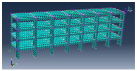 After building the structure prototype in AutoCAD, the igs files of components are imported into ABAQUS, as shown in Figure 9. Units of the ABAQUS model are mm, t, s and N. The C3D8R Solid units are utilized for the concrete beams and columns due to them easily converging. In addition, the T3D2 Truss units are used for rebar to increase the computation efficiency, while the SR4 Shell units are utilized for the floors aiming to reduce the number of solid units. The units and connecting parts are indicated in Table 2. The joint areas of the beams and columns are locally encrypted mesh with a size of 150 (mm), while the remaining mesh has a size of 700 (mm), as shown in Figure 10. Constitutive relations of the materials are shown in Figure 11, and the CDP model is used in the C30 [13,14,15]. Self-weight of the materials was considered, and associated gravity loads are applied in the columns with 0.35 axial compression ratios, which were calculated by PKPM.