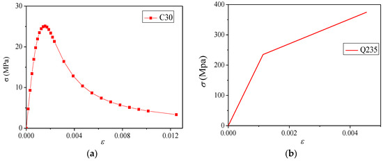 Constitutive relations of the materials. (a) Constitutive relation of C30. (b) Constitutive relation of Q235.
