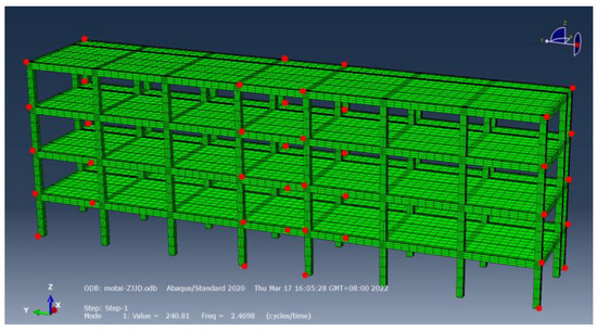 Each working condition of the model is input with the corresponding ground vibration based on the different site categories and protection levels. Eight spots evenly distributed on each floor are chosen to extract the displacement, as illustrated in Figure 12.