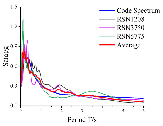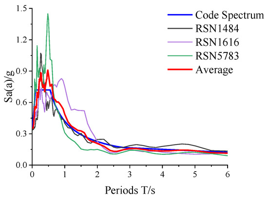 We considered the site effects, including Sites II, III, and IV, and choose the response spectrum in the code (later referred to as the code spectrum) as the input target spectrum to the PEER’s NGA-west2 database for picking relevant ground motion recordings. After matching, three representative ground motions were chosen, and the selected processes of Sites II and III under rare seismic protection are depicted in Figure 13 and Figure 14. Meanwhile, the rest of the process will not be expanded. The ground motion recordings are truncated, and the response spectra are compared to validate the correctness of the truncation lengths, as shown in Figure 15 and Figure 16 [16,17,18,19]. The peak acceleration of the code spectrum under each protection level is 0.12 g, 0.34 g, and 0.72 g, respectively.