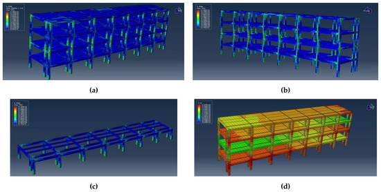 The stress in the structure is mainly concentrated in the columns. The stress in the bottom of the columns on the first floor is concentrated on the verandah side, while the stress in the columns of other floors is concentrated on the long-span side. The results shown in Figure 18a reveal the ‘strong beam and weak column’ phenomenon which is consistent with the seismic damage. Meanwhile, the maximum displacement in the X direction appears in the top column of the first and second floors, showing the unreasonable displacement distribution of the whole structure in Figure 18d.