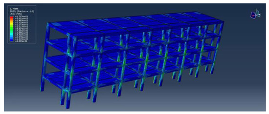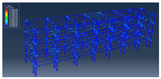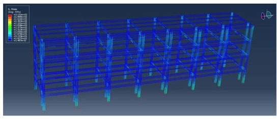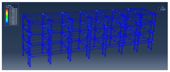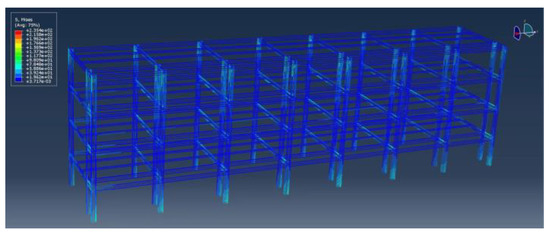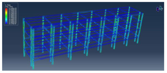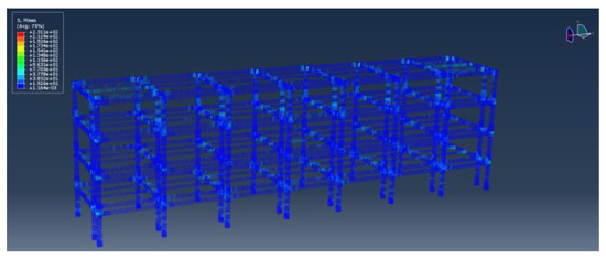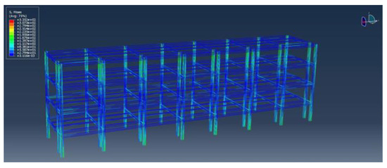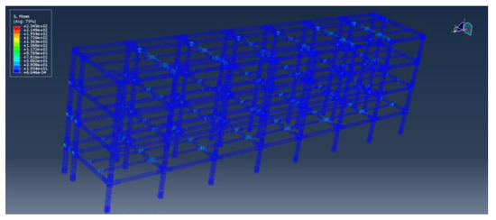 Furthermore, the main stress direction of the structure in Figure 27 shifts from the weaker X direction to the Y direction, and the stress gap between the bottom and top columns on each floor decreased. The shear performance of the structure in the X direction improved due to the space narrowing in the hoops of beams and columns, causing the stress direction changes in the Y direction. The stress in the longitudinal rebar is mainly concentrated on the first and top floor of the structure, and the longitudinal rebar in the beam-column joints and part of beams is obviously stressed, as shown in Figure 28 and Figure 29.