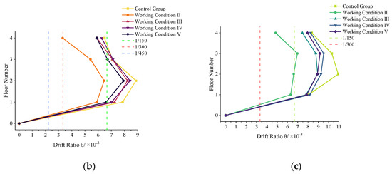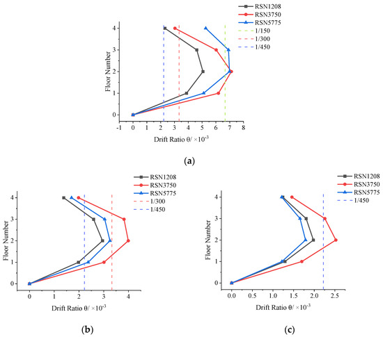 Drift ratio in site II under different protection levels of the structure. (a) Rare earthquakes. (b) Fortification earthquakes. (c) Frequent earthquakes.