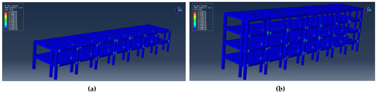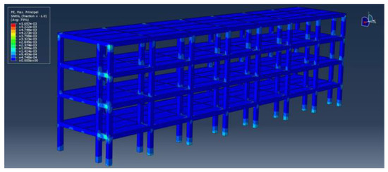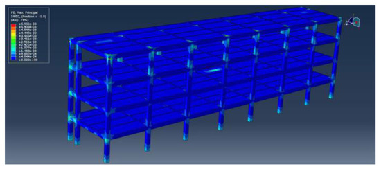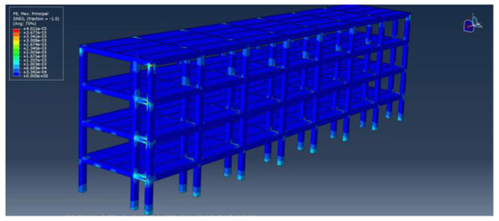 There are 27 simulation models for the structure prototype. Taking the results of RSN1208 as an instance, the distribution of structural stress reveals the magnitude phenomena of the corner columns of long-span are greater than the corner columns of short-span, the side columns of long-span and the side columns of short-span and center columns, which means the magnitude of stress in corner columns is greater than side columns and center columns. From Figure 17, which is the principal plastic tensile strain, the strains of the beams and columns on the structural short-span side are greater than those on the long-span side, and the strains of corner columns are significantly larger than those of the center and side columns. Moreover, strains on top of the columns are greatly larger than those on the bottom.