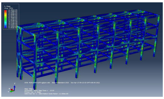 The stress in the longitudinal rebar is mainly concentrated in the bottom and top of the structure, part of the frame beams, and the short-span side, which is shown in Figure 32. The stress in the hoops is mainly concentrated in the corner columns and part of the beam-column joints. The hoops’ stress of the beam-column joints in the two corner columns on the verandahs and short-span sides is significantly higher than that of the long-span side, as shown in Figure 33.