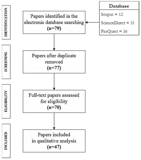 This study included only articles published online between 1 January 2002 and 30 September 2022. This stage identified 12 articles from Scopus, 31 papers from ScienceDirect, and 36 papers from ProQuest. Overall, this work included 79 articles in the first screening phase. Even though many articles published in conference proceedings are in a good state, they were not further analyzed because many proceedings’ analysis is not as thorough as journal articles [25]. Figure 1 illustrates the PRISMA framework executed in this study.