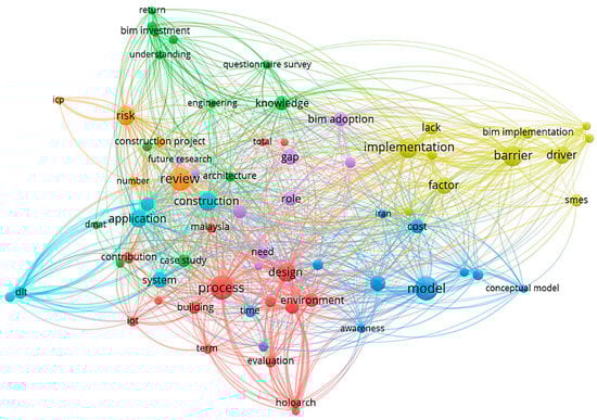 Word co-occurrence data indicated certain relationships and were utilized as a foundation for semantic knowledge. For this purpose, this study used the meta-file “Research Information System” extension of 47 included articles and VOSviewer software. The title and abstract fields of the papers evaluated were assessed using a co-occurrence map based on text data. A full counting method analysis with a minimum threshold of five occurrences was chosen. Figure 3 portrays the terms associated with BIM innovation in developing countries.
