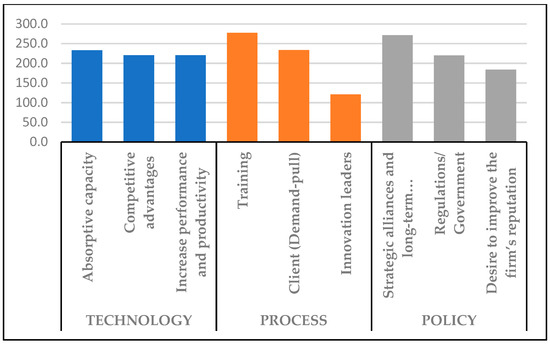 The primary category that drives BIM innovation in developing countries is technology (Figure 4). The top three factors of this category are absorptive capacity, competitive advantages, and increased performance and productivity. The process category is the second-highest driver, with training, the client (demand-pull), and innovation leaders as the major factors. Finally, the policy category is the last driver with the factors, i.e., strategic alliances and long-term relationships, regulations/government, and the desire to improve the firm’s reputation. The scores and ranks of BIM innovation drivers are listed in Table 8.