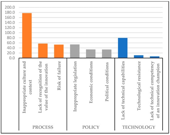 The most prevailing BIM barriers in developing countries are classified in the process category (Figure 5). Inappropriate culture and context, lack of recognition of the value of the innovation, and risk of failure are the top three factors of this category. The second-highest barrier is the policy category, with inappropriate legislation, economic conditions, and political conditions as the primary factors. Lastly, the technology category is a barrier with corresponding factors, i.e., lack of technical capabilities, technological resistance, and lack of technical competency of an innovation champion. The scores and ranks of barriers to BIM innovation are listed in Table 9.