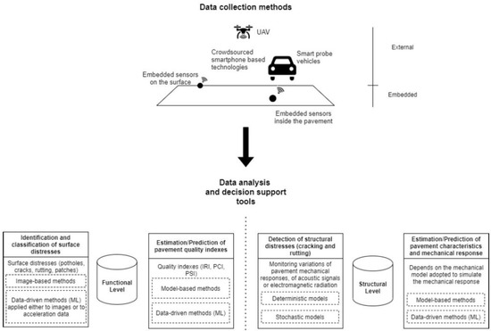 On the other hand, a few pieces of research fill the gap between innovative data collection technologies and data analysis methodologies that are likewise based on novel intelligent approaches and suited for inclusion in DSS for smart pavements. Machine learning and other analysis technologies can extract meaningful information from this data, enabling pavement diagnosis and predictions. In addition, for a decision-making system, it is essential to have a relationship between the data and analysis section.