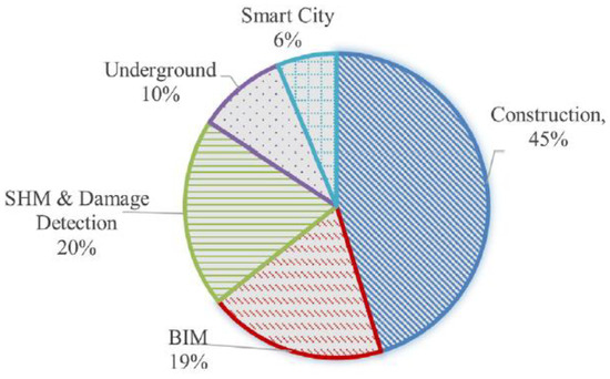 Based on the capabilities of game engines in producing AR experiences [47], there are two main methods for AR applications categorization in civil infrastructure: by item (bridges, large structures, and rail lines) or by real applications (engineering layout, Structural Health Monitoring (SHM), structural design, manufacturing, and others [48]. Figure 4 illustrates the proportion of AR applications in engineering structures from 2016 to 2020, broken into five categories: smart city, construction, building information modeling (BIM), SHM and damage detection, and subsurface utilities [49].