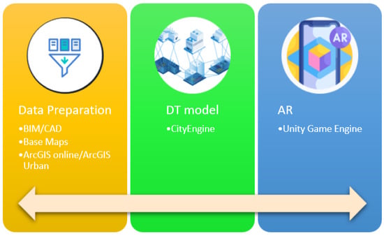 In 2016, when the industrial revolution shifted into a new phase [6], augmented reality (AR) emerged as the most important technical evolution. AR adds interactive virtual objects and pictures to real-world settings. Due to the fact that AR is interactive and transparent, it offers a technological advantage over virtual reality (VR). In addition, AR in PMS can help avoid costly mistakes, increase efficiency, persuade municipal officials to make more efficient investments in urban infrastructure, and save money [7]. To move toward a smart city, including a brilliant PMS, game engines are being applied to build augmented reality experiences. As an illustration, Figure 1 shows a simplified view of the AR experience in an urban area.