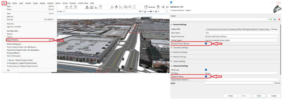 It would be necessary to extract pavement footprints before moving on to the primary 3D model of this analysis stage. Pavement polyline extraction is complex and requires more investigation. For pavement polyline extraction, first, it would be necessary to filter the LiDAR point cloud (LAS) dataset and access the road points. Then, the appropriate raster would be prepared to run the LAS point statistics as a raster tool. Applying another tool to convert this raster to a polyline makes us move forward with the extraction of pavement polylines. However, some graphical works are needed to clean the feature class created and access the best appropriate geometrical shape of the pavements. Figure 11 provides a schematic view of all the steps required in this study before entering the CityEngine model.