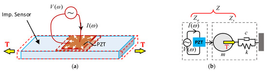 Illustration of transducer and structure interaction (V(ω): applied voltage, I(ω): current, T: axial load, Za: impedance of PZT, Zs: impedance of host structure, m: mass, c: damping, and k: stiffness constant). (a) Piezoelectric deformation; (b) 1-dof system.