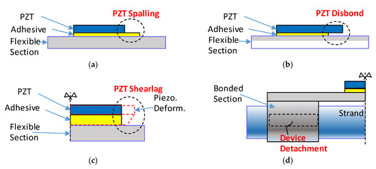 Under working and environmental conditions, the piezoelectric-based smart strand can be damaged, resulting in visible impedance changes, which can be misunderstood as the presence of structural damage (i.e., the PS load change). From the literature [16,21,22,25], we identify four potential fault types that may occur for piezoelectric devices such as the smart strand, including transducer breakage, transducer disbond, shear-lag phenomenon, and device detachment, as illustrated in Figure 3.