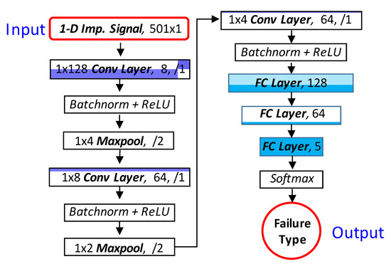 The 1D CNN model is developed to detect and classify the fault types that may occur in the smart strand, as sketched in Figure 5. The architecture of the 1D CNN model is built following the previous well-established models [38,40]. The architecture and hyperparameters of the 1D CNN model were tuned following the practical guidance of Zhang and Wallace [41]. Input of the network has one dimension that fits with the size of the training dataset (i.e., 1D impedance signal with the size of 501 × 1), while the output is the classification of the fault types. As designed, the 1D input layer is sequentially followed by a convolutional layer with 1 × 128 kernel, a maxpooling layer with 1 × 4 kernel, a convolutional layer with 1 × 8 kernel, a maxpooling layer with 1 × 2 kernel, a convolutional layer with 1 × 4 kernel, a fully-connected layer with 128 nodes, a fully-connected layer with 64 nodes, a fully-connected (FC) layer with 5 nodes, a softmax layer, and a classification output layer. Each of those three convolutional layers is followed by a batch normalization layer and a ReLU layer, see Figure 5.